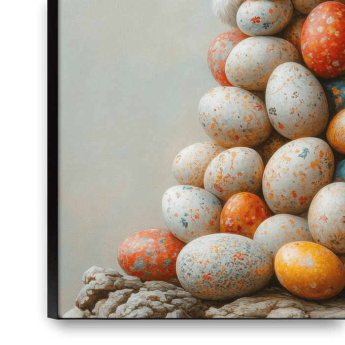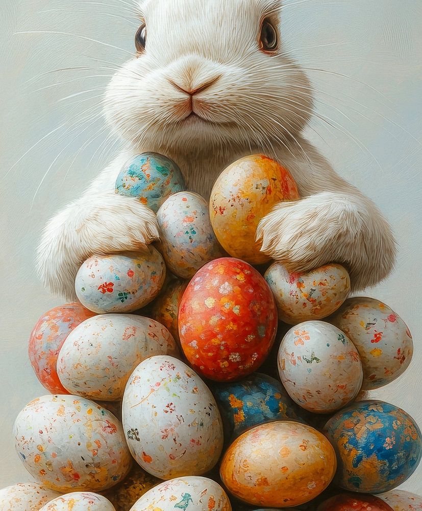 A soft, white Easter bunny looks straight at you whilst protectively holding a large pile of colourful eggs. The eggs form a playful tower, each with unique speckles and warm hues such as orange, blue and yellow. The whole scene exudes a cheerful and peaceful atmosphere, as if time has stood still for a moment in a moment of pure…