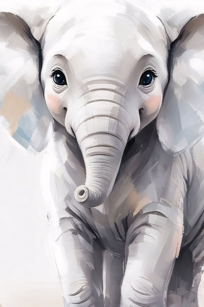 This charming design shows an adorable baby elephant in a minimalist and soft digital art style. With its big eyes and playful look, it conveys a sense of softness and joy. The background consists of subtle brush strokes in neutral tones such as beige and grey, which draws full attention to the little elephant. This design would fit perfectly in a calm and inviting space such as a bedroom or office, where it adds a touch of playfulness without being overpowering. The use of a limited colour palette adds to the serene look, while the delicate details give it a sophisticated, modern feel. A perfect choice for lovers of animals and minimalist art.