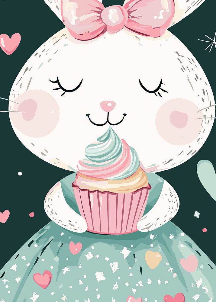 This enchanting motif shows a cute white bunny with closed eyes and a gentle smile, lovingly holding a cupcake in its paws. The pink bow on his head and the detailed, turquoise-coloured dress with sparkling stars and hearts lend the scene a playful and romantic atmosphere. The dark background is decorated with small stars, hearts and soft colour accents that harmoniously round off the overall picture. Ideal for children's rooms, greetings cards or decorations with a touch of magic.