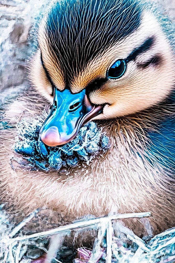 This unique artwork depicts an adorable duckling with a beautiful bluish hue and soft accents. The fine details of the plumage combined with the vibrant colours give a modern and sophisticated feel to this design. Perfect for animal and nature lovers, this image brings warmth and charm to any room. The design is a striking choice for a living room or office, where it can become a subtle yet captivating focal point. The modern nature of the artwork fits well into contemporary interiors, while the natural details evoke a sense of serenity and beauty.