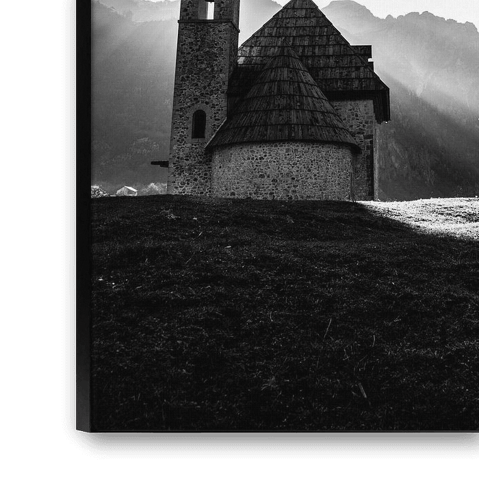 Cute little church in the mountains in autumn. Sunrise over the mountains of Albania. Sunbeams through the morning fog and the yellow autumn leaves.