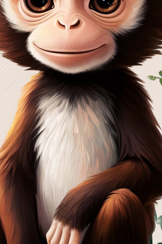 This vibrant digital artwork shows an adorable young monkey sitting on a branch surrounded by green foliage. The monkey's soft brown and white tones contrast beautifully with the bright green of the plants. With its large, shining eyes and friendly smile, the monkey conveys a sense of joy and curiosity, making this design perfect for a children's room or a modern workspace. The detailed rendering of both the monkey and its surroundings gives the image a realistic yet playful feel. This artwork can brighten up any room and offers a playful, cheerful look.