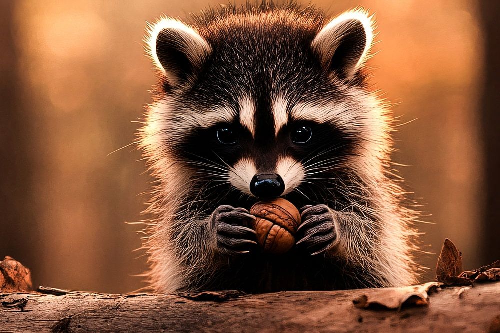 A cute raccoon with a nut in its paws stands on a tree trunk amidst a beautiful autumn forest. The warm play of colours of orange and brown exudes a serene atmosphere, perfect for giving your home or workspace a cosy feel. The detailing of the animal and its surroundings makes this design unique and enchanting. Suitable as a decoration for different rooms, such as the living room or dining room, it brings a touch of nature inside.