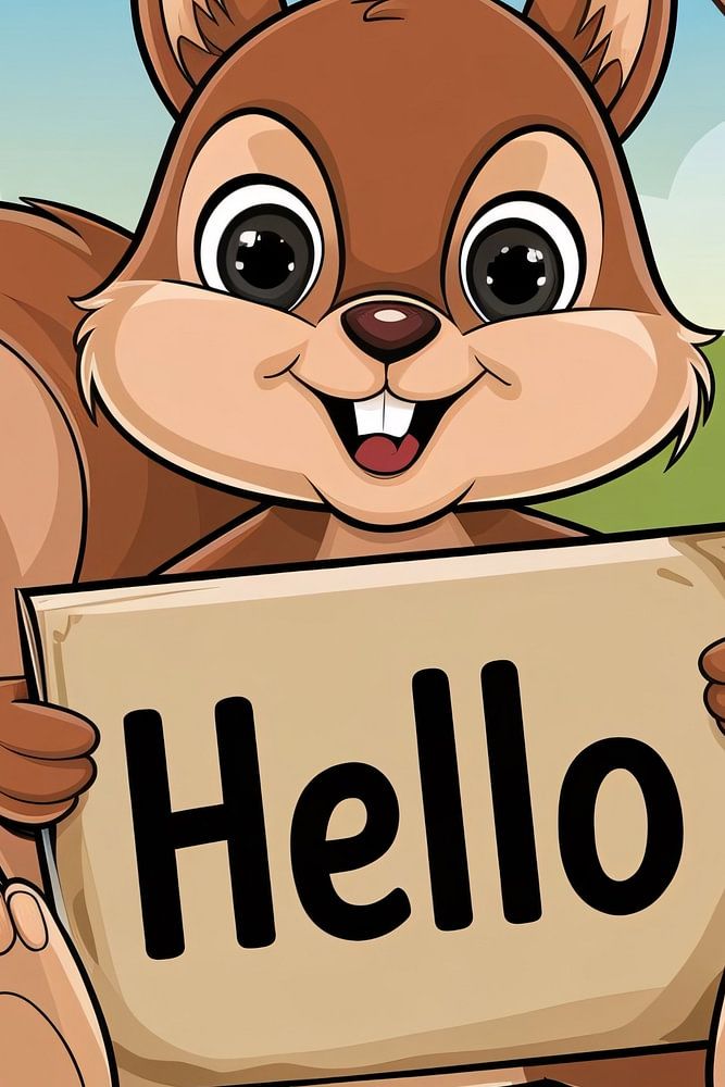 This cheerful illustration shows an adorable squirrel holding a sign with the text "Hello" from a tree. The colourful design uses bright and warm tones that create a playful and friendly atmosphere. Perfect for use in children's rooms, or as a cheerful addition in living spaces such as the kitchen or living room. The squirrel radiates joy and is guaranteed to make you smile. This design is also ideal for posters, cards or other decorative purposes that want to convey an inviting and positive message. The design combines animal charm with modern, graphic elements and fits well in contemporary interiors.