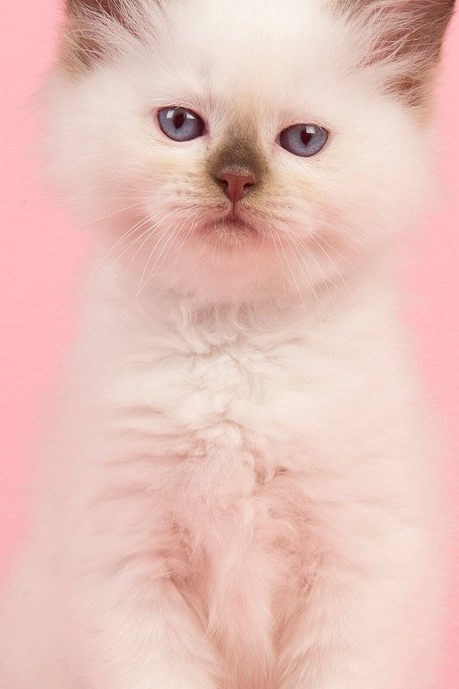 Cute 6 weeks old rag doll baby cat with blue eyes looking at the camera sitting on a pink background