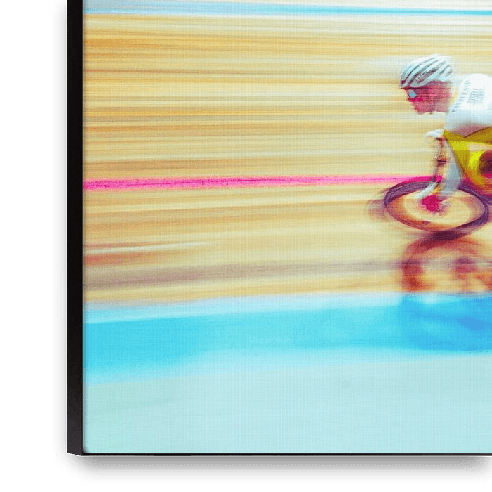 This intriguing composition captures the speed and energy of a cycling race in a unique, surreal way. The movement of the camera creates a smooth blur that emphasises the intensity and power of the athletes. The colours - ranging from bright yellows and blues to soft shades of white and grey - enhance the dynamics and give the image an…