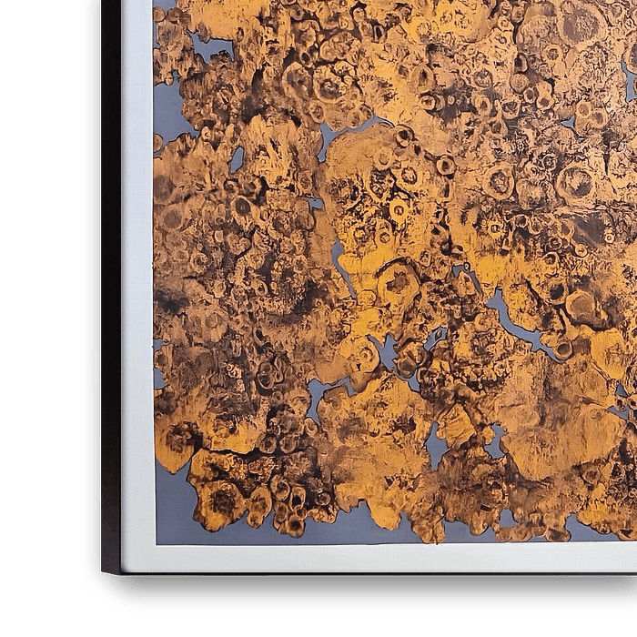 Orange-yellow tones with brown contrast emerge from the blue-grey background.