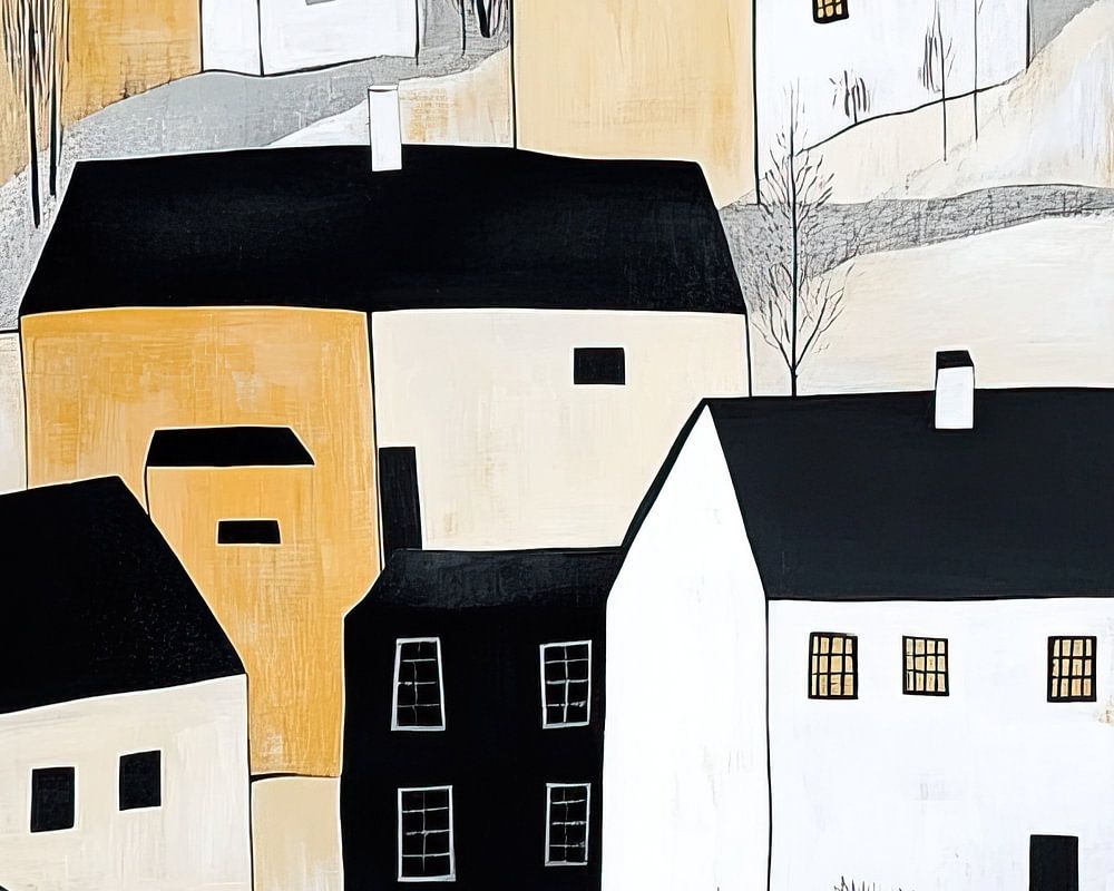 Czech Art | Hushed Mountain Tales - This abstract painting stylistically depicts a collection of houses and hills, with the simple shapes and limited colour palette evoking a calm and harmonious image.