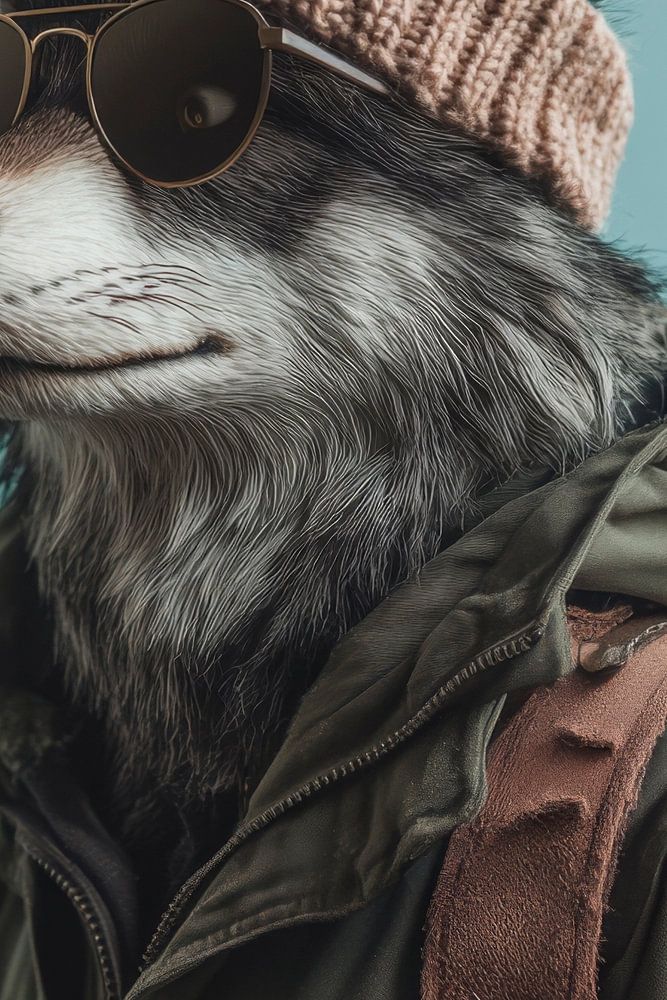 Wearing a cosy parka and a stylish hat, this Czechoslovakian wolfhound defies the grey of everyday life. The sharp, wolf-like features and cool sunglasses give it an urban charm, while its majestic nature makes you feel connected to nature. Here, personality meets elegance in a harmonious interplay.