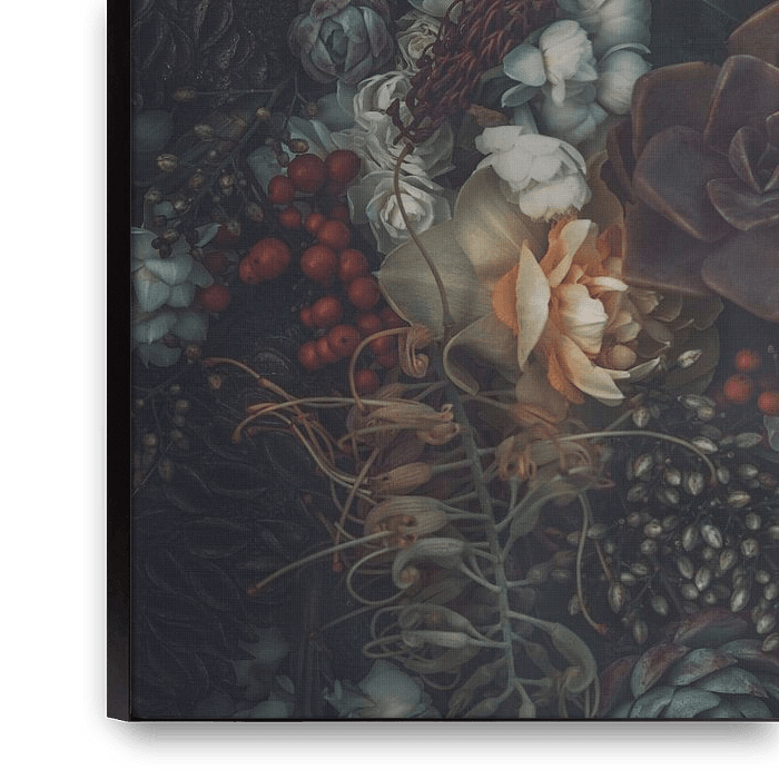 A collection of early Spring blooms, Daffodils, succulents, Tulips and various botanical elements. Fine art photograph on a dark textured background