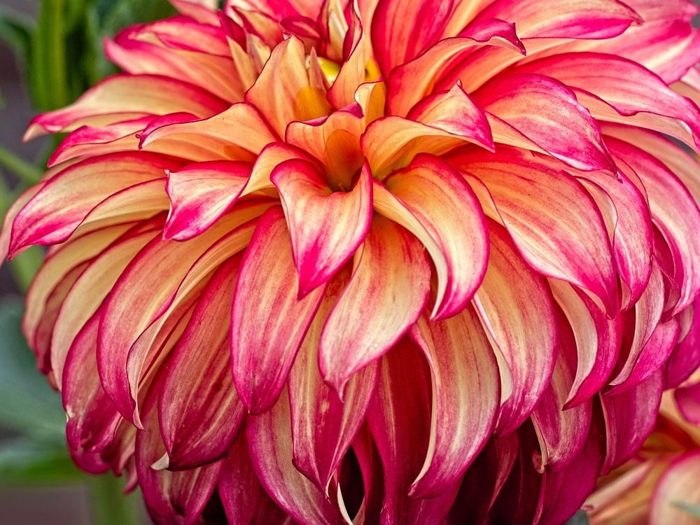 Close-up of the flower of a red-and-yellow Dahlia plant.