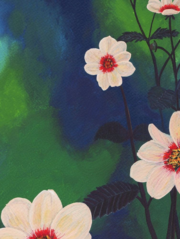 Gouache of salmon-pink dahlia's on a diffuse background of blue and green. The dahlia (Happy Single Kiss variety) has a red flaming heart and dark, purple stems and leaves.
