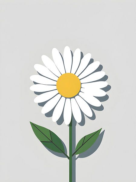 A charming minimalist illustration of a classic white daisy with dimensional petals and a cheerful golden yellow center. The subtle shadowing creates depth and dimension, while the crisp white petals contrast beautifully with the soft gray background. Green leaves at the base complete this timeless composition, capturing the simple joy…