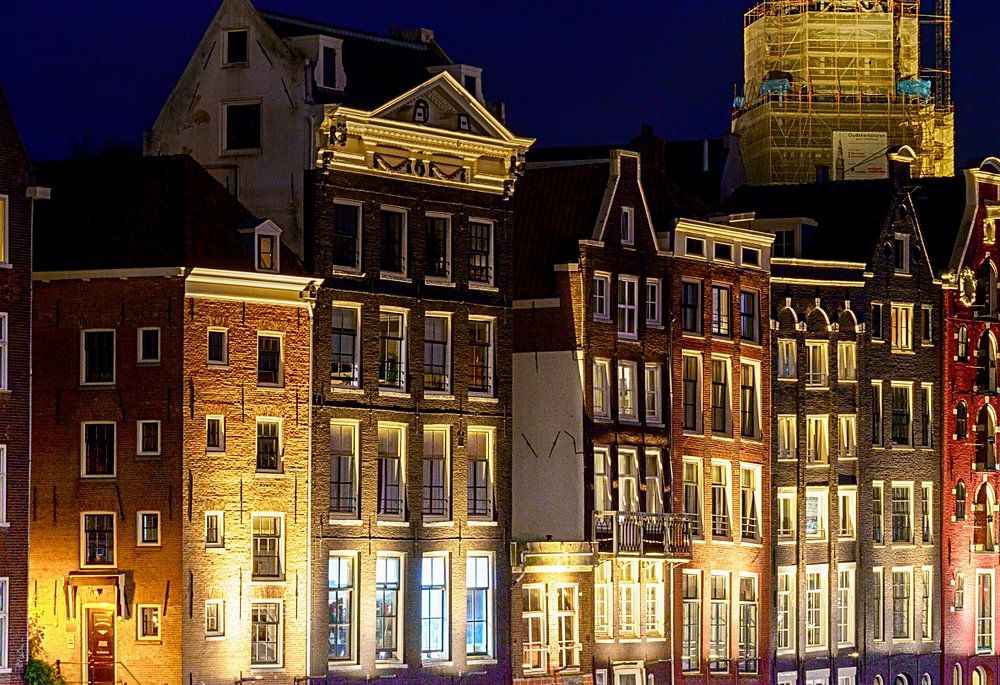 Damrak Amsterdam at night. Special architecture. cozy neighborhood with beautiful illuminated houses on the Damrak.