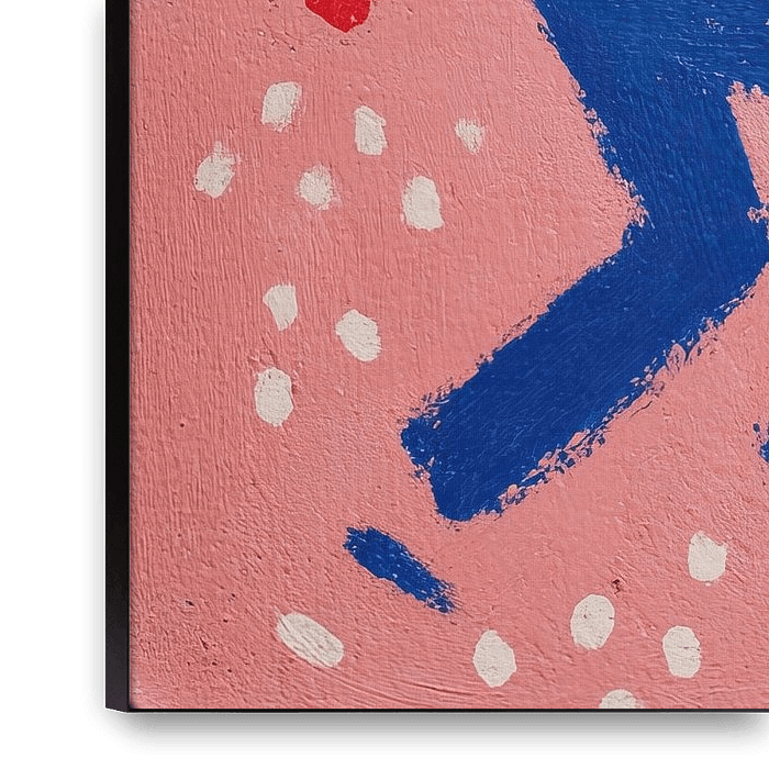 Dance Painting | Joyful Movement Together - This is a dance painting featuring a man and woman moving hand in hand, with a striking pink background and a cheerful blue dress with white dots. Details: dance, man, woman, pink, blue, dots, energy, movement, celebration, modern Colours: pink, blue, white, red Dance Painting