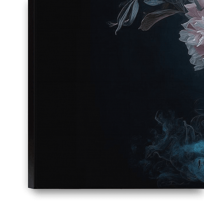 A dramatic still life in which delicate peonies and ranunculus in soft pink and white tones take center stage, placed in a striped vase against a deep blue background. The composition is enhanced by graceful strings of smoke that envelop the flowers, creating a mysterious, almost surreal atmosphere reminiscent of the old masters but…