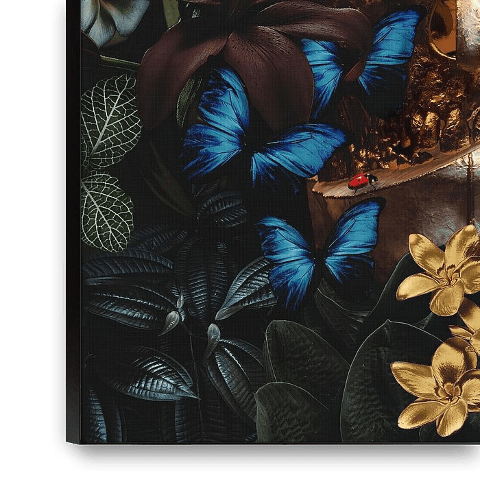 This artwork, with a delicate balance between life and death, symbolises the cycle of existence. The golden skull represents mortality and decay, while the blue butterflies represent the fleeting and beautiful nature of life. The flowers and plants around the skull emphasise growth and regeneration, even in the presence of impermanence.…