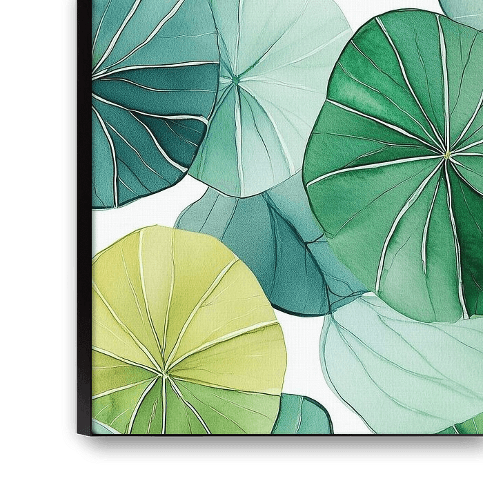 Playful pattern of overlapping, round leaves reminiscent of aquatic plants such as lotus leaves or water lilies. The variation in shades of green - from soft lime green to deep dark green and bluish green - creates a lively and fresh look. Each leaf disc is detailed with fine lines and subtle veins, creating a natural depth. The white background enhances the brightness and airiness of the composition, making the leaves almost seem to float.