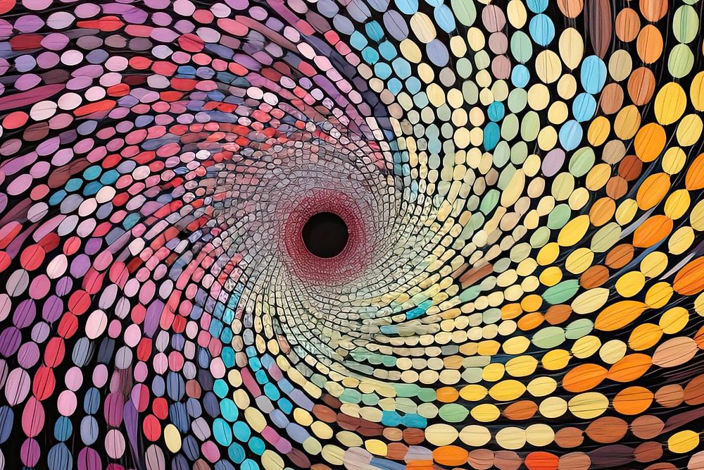 Dance of the Dots | Mandala Artwork - In this eye-catching mandala, dynamic curves and a diverse colour palette come together to create a sense of movement and depth. The hypnotic pattern consists of carefully placed, colourful dots leading to the dark centre, giving an almost 3D illusion.