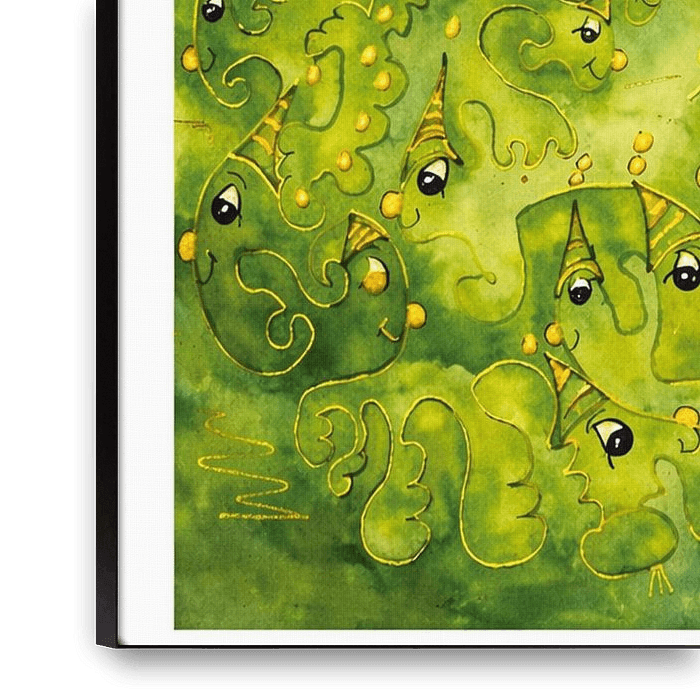 This lovingly crafted work of art transports the viewer into a playful, imaginative world teeming with lively creatures. Small, mischievous figures with long noses, curved bodies and delicate, pointed hats emerge from flowing, organic forms. They appear to be a blend of forest spirits, dream creatures and cheerful nature sprites, united…