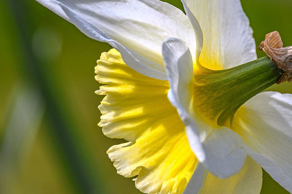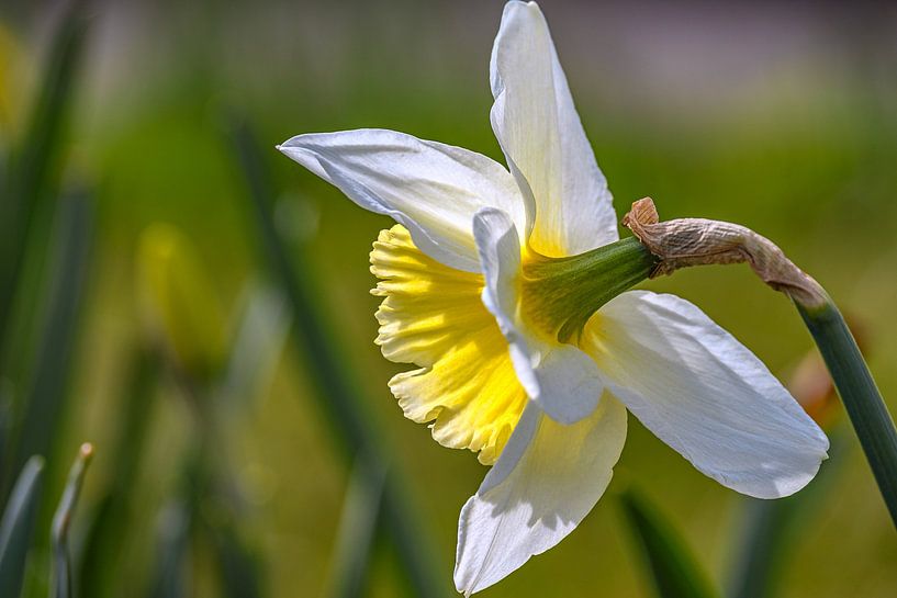 The spring sun gently bathes the bright yellow heart of this daffodil, whose white petals seem to dance like delicate sails in the wind. This detailed macro shot reveals nature’s intricate architecture and makes the anticipation of warmer days palpable in every pixel. Amidst the fresh greenery, the flower stands as a proud harbinger of…