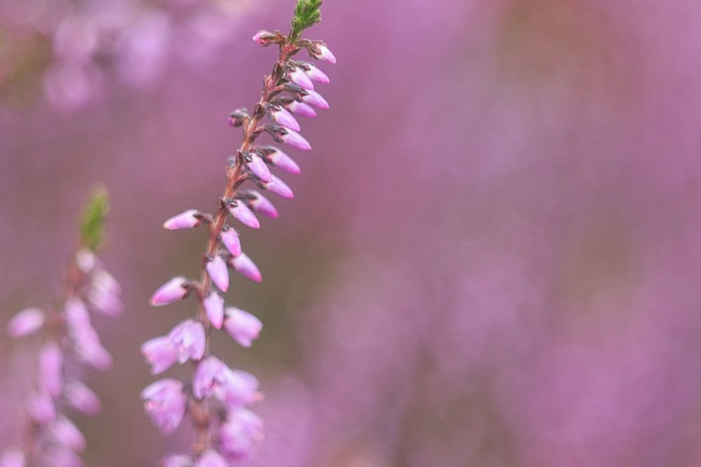 By creating a great depth of field, the background is a blur so the heather in the foreground gets all the attention.