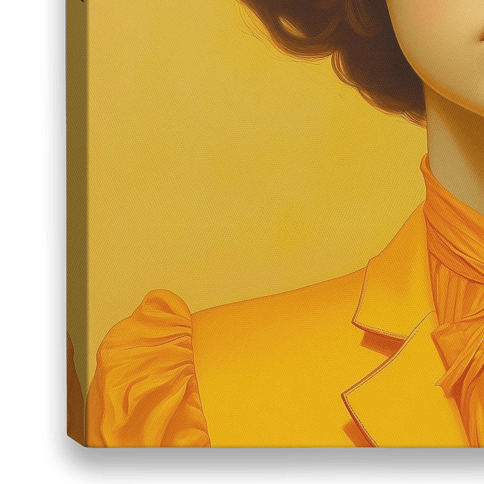 A woman in a monochrome yellow universe holds a fluffy dandelion in front of her face, while her eyes remain closed behind round, gold-tinted glasses.