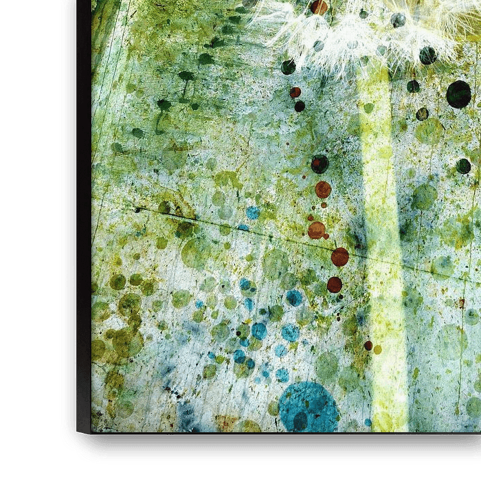 A dandelion photographed in my garden with its white seed umbrellas stands out against a vibrant watercolour background. The abstract, expressionistic background in blue-green with dark red, blue and green splashes of colour provides a strong contrast that emphasises the delicate structure of the dandelion.