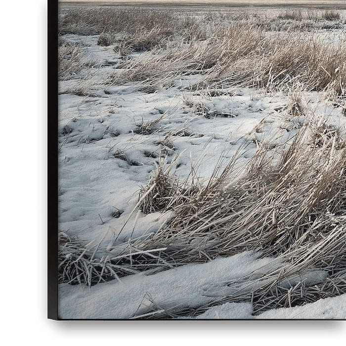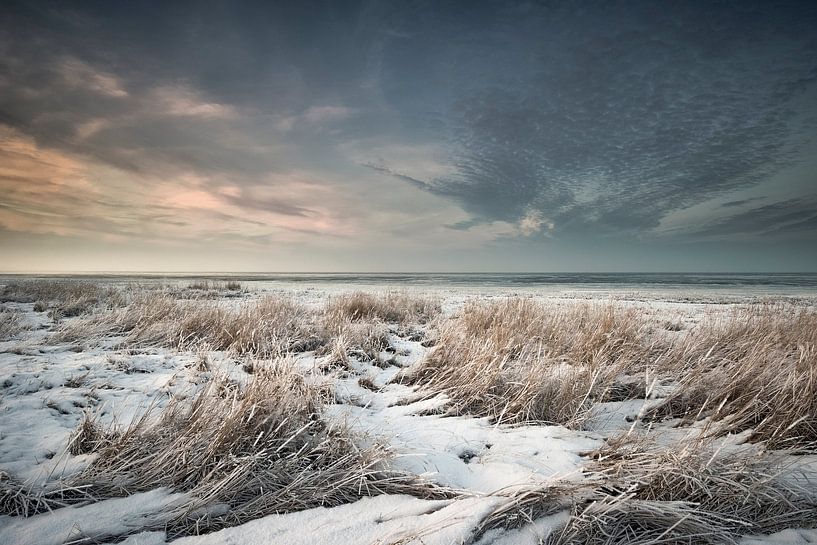 The landscape photograph "Dangast in Winter" shows snow-covered reeds on the North Sea coast at sunset. Taken on a cloudy evening in the winter of 2016.