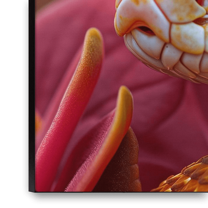 Portrait of a snake with strikingly detailed and colourful scales. The sharpness of the image focuses on the reptile's textured skin and bright, shiny eyes, which have a mesmerising effect. The main subject stands out clearly against a blurred background that highlights the snake's texture and vibrant colours.