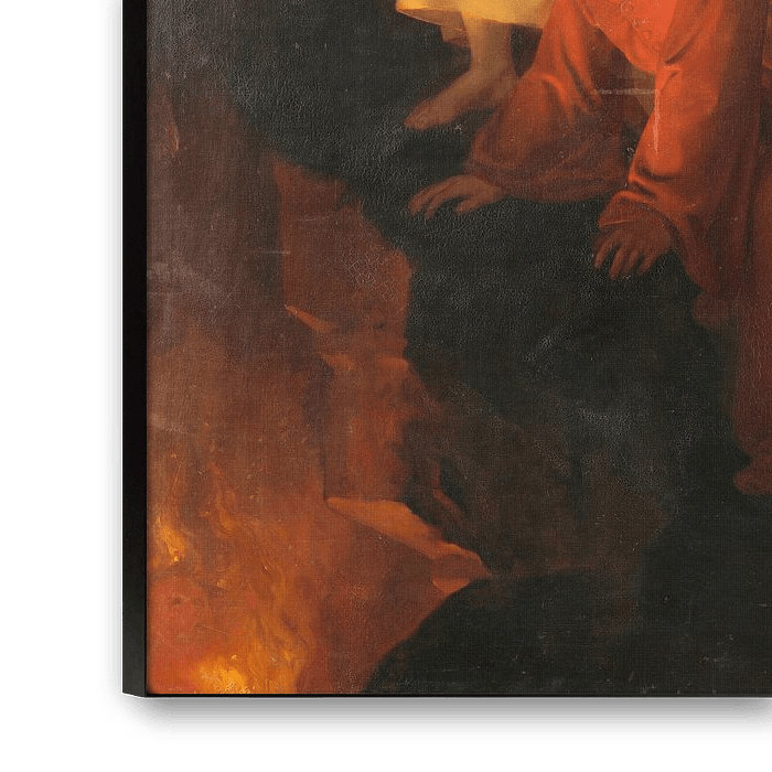 On a surface of pronounced reddish shades, the figures of Dante and Virgil can be distinguished. In the upper part of the painting, Virgil, dressed with an old-styled white tunic and crowned with bay leaves, is sitting over a couple of rocks and, with a peaceful expression, raises his right hand as a sign of speaking. Underneath him, Dante, dressed in red as in a medieval custom and crowned with bay leaves, lays his torso in order to put his hands on the rocks in which he relays. He observes with a gesture of horror the scene that is developing in the background: in a cavity that occupies the lower left part of the painting, intense flames burn, among them some characters can be appreciated. The reddish color of the flames that come out of the inferno invade the canvas in this tonality.