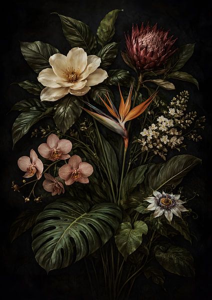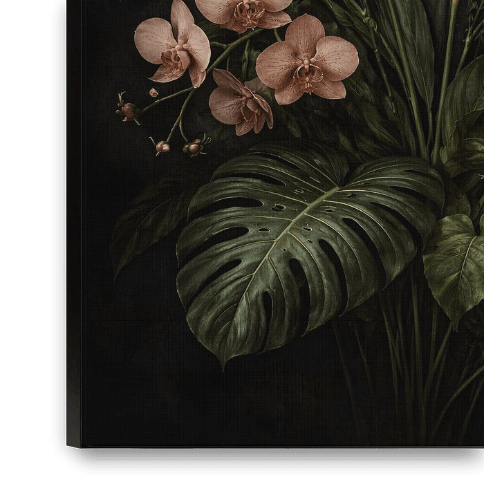 Luxurious dark botanical artwork featuring exotic flowers, lush tropical leaves, and dramatic lighting on a deep black background. This elegant floral composition adds a moody, sophisticated atmosphere to modern, boho, or luxury interiors.
