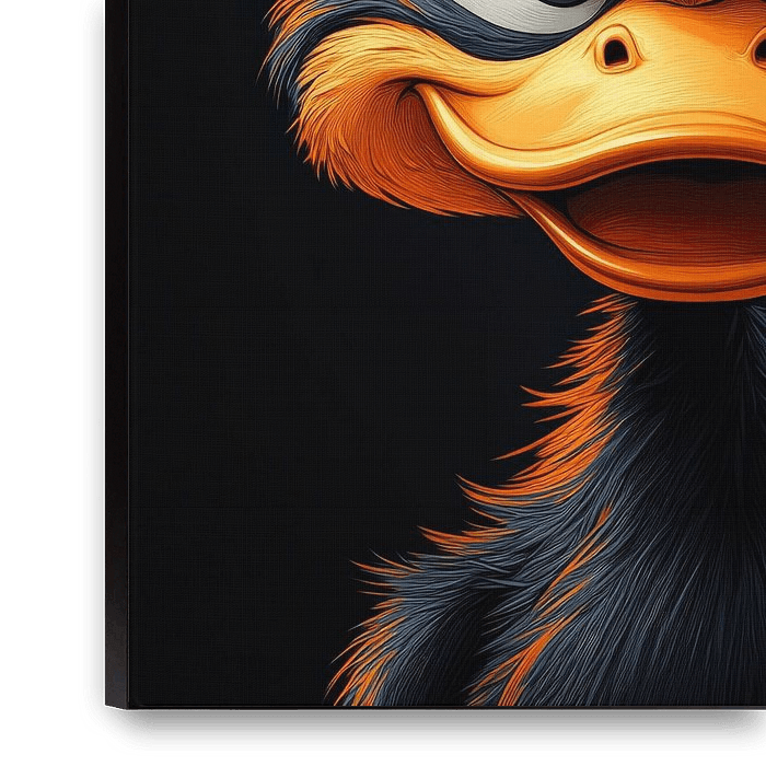 A striking digital artwork of a fierce black duck with glowing orange eyes and sharp, detailed feathers. The dark lighting and dramatic expression create a powerful presence, blending realism with a bold, stylized touch. A character full of attitude and mystery!