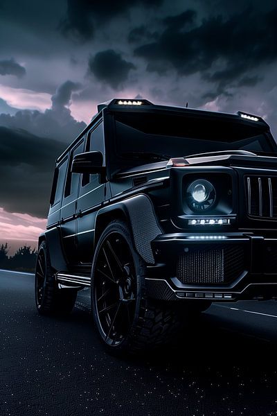 A sleek, matte black Mercedes-Benz G-Wagon stands tall under a stormy twilight sky. Its carbon fiber widebody kit and massive custom wheels exude a sense of dark luxury and unmatched street presence. A true king of the urban jungle.