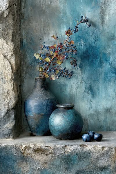 This dark still life shows handmade ceramics in shades of blue-green, combined with subtle berries and natural textures. The soft light and rough background create a calm, poetic atmosphere with depth and character. A timeless painting that adds warmth and sophistication to a modern interior.