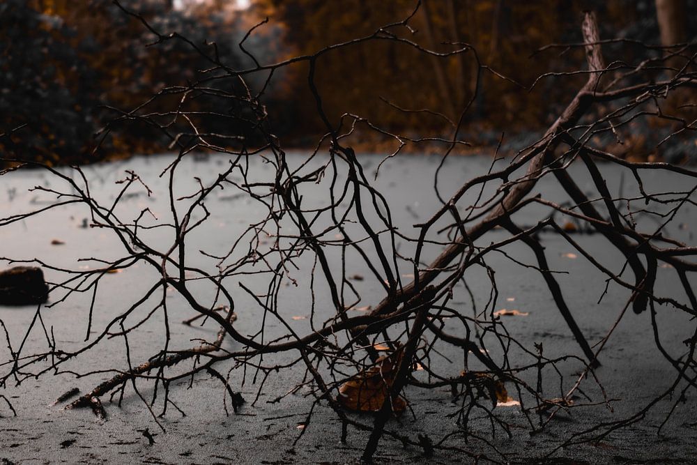 This work captures the serene atmosphere of an autumn forest. A branch lies over still water, surrounded by warm autumn leaves. The dark tones of the branches contrast with the soft light and fading background, giving a mystical and tranquil feel.