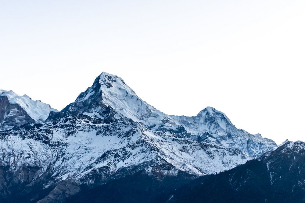 Dark snowy peaks in the Annapurna Massif in the Himalayas in the morning. Seen from Poon Hill close to Ghorepani in Nepal.