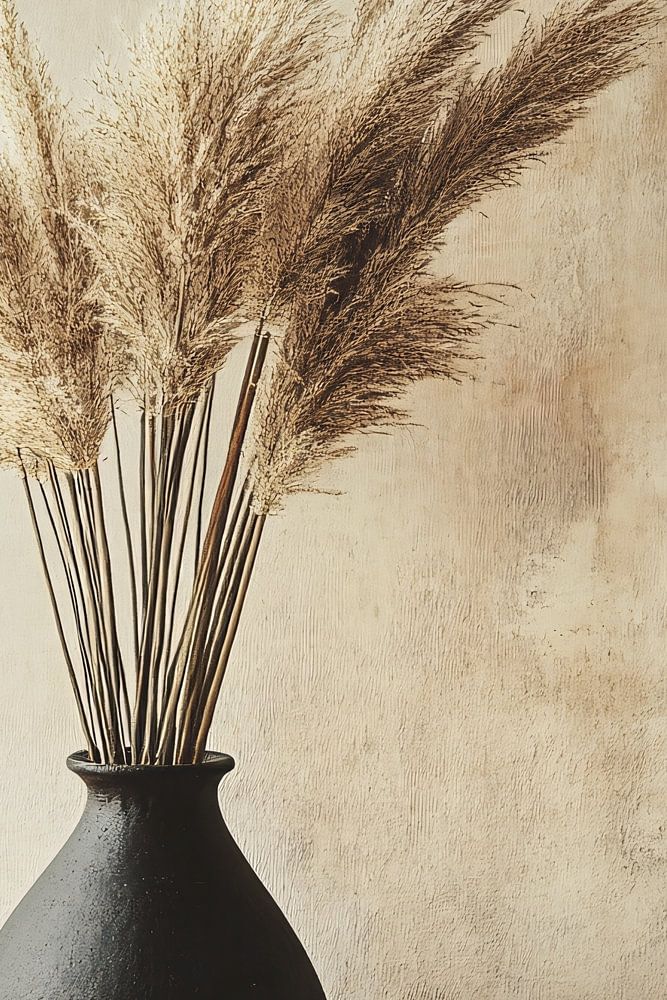 This minimalist design exudes calm and elegance, with a dark, earthy vase filled with graceful pampas grass. It is the perfect addition to an interior that seeks balance and simplicity. The natural tones, from deep black to soft beige tones, create a harmonious atmosphere that is both warm and timeless. Ideal for the living room or hallway, this decoration fits within various styles, such as Japandi and modern minimalism. The combination of organic shapes and neutral colours makes it a versatile choice for any home.
