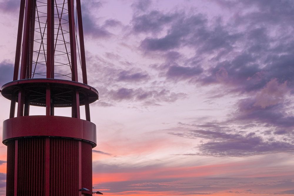 Landmark "Das Geleucht" on the Rheinpreussen slagheap in Moers at sunset, North Rhine-Westphalia, Germany