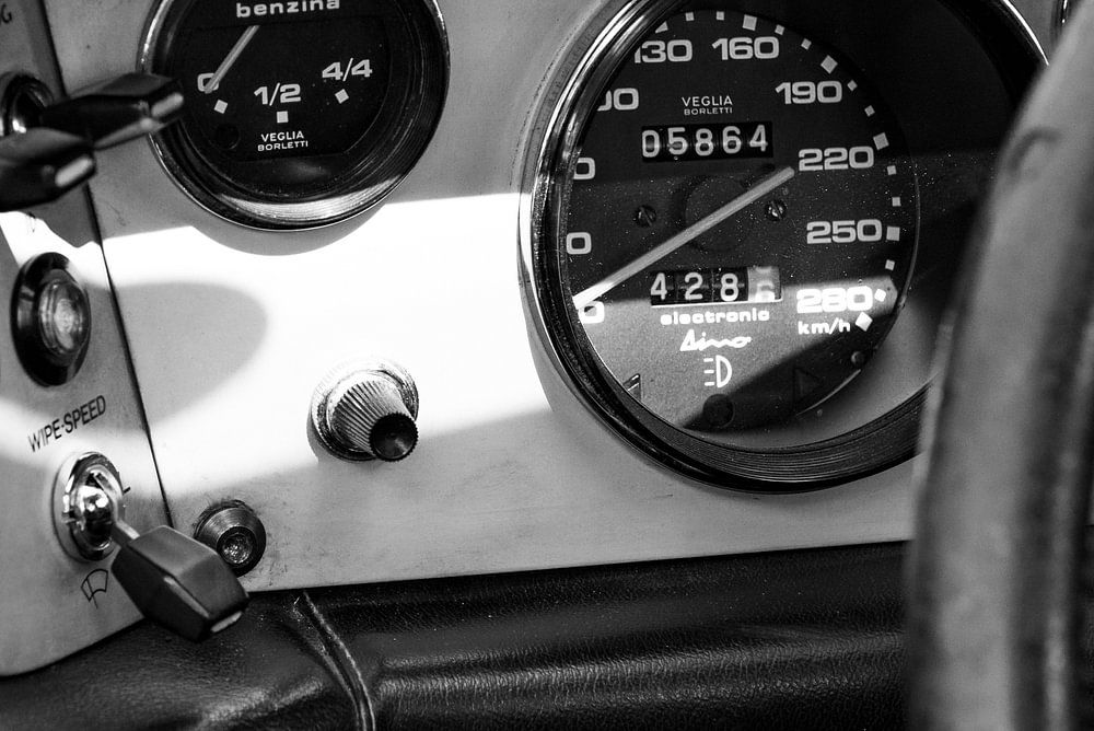 Dashboard on a 1970s Ferrari 308 GT4 Dino sports car in black and white. Even though the first series were not even called Ferrari's but just Dino, the 308 GT4 was a groundbreaking model for Ferrari as it was the first production Ferrari to feature the mid-engined V8 layout.