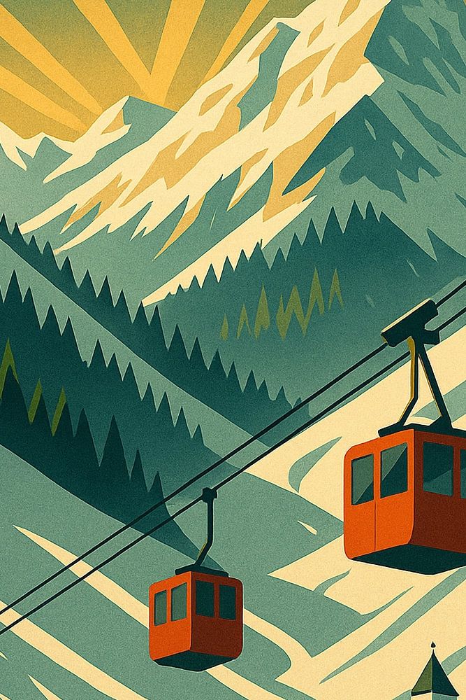 This Art Deco travel poster of Davos highlights the exhilarating charm of Switzerland’s highest alpine town, renowned for its world-class ski slopes, winter sports, and breathtaking landscapes. Featuring bold red cable cars gliding across snowy mountain valleys, the composition conveys both elegance and adventure. Radiant light beams illuminate the dramatic peaks, enhancing the vintage charm of this artwork. Designed in a timeless retro style, this poster is perfect for anyone who loves skiing, snowboarding, hiking, or alpine exploration. The clean lines, stylized details, and harmonious color palette make it an eye-catching piece of wall art that fits beautifully into modern interiors, studios, or mountain lodges. Celebrate Davos as a destination of winter wonder and international prestige with this poster that captures the essence of alpine travel during the golden era of Art Deco. Ideal for collectors, design lovers, and outdoor enthusiasts, it is a striking tribute to Davos’ legendary alpine atmosphere.