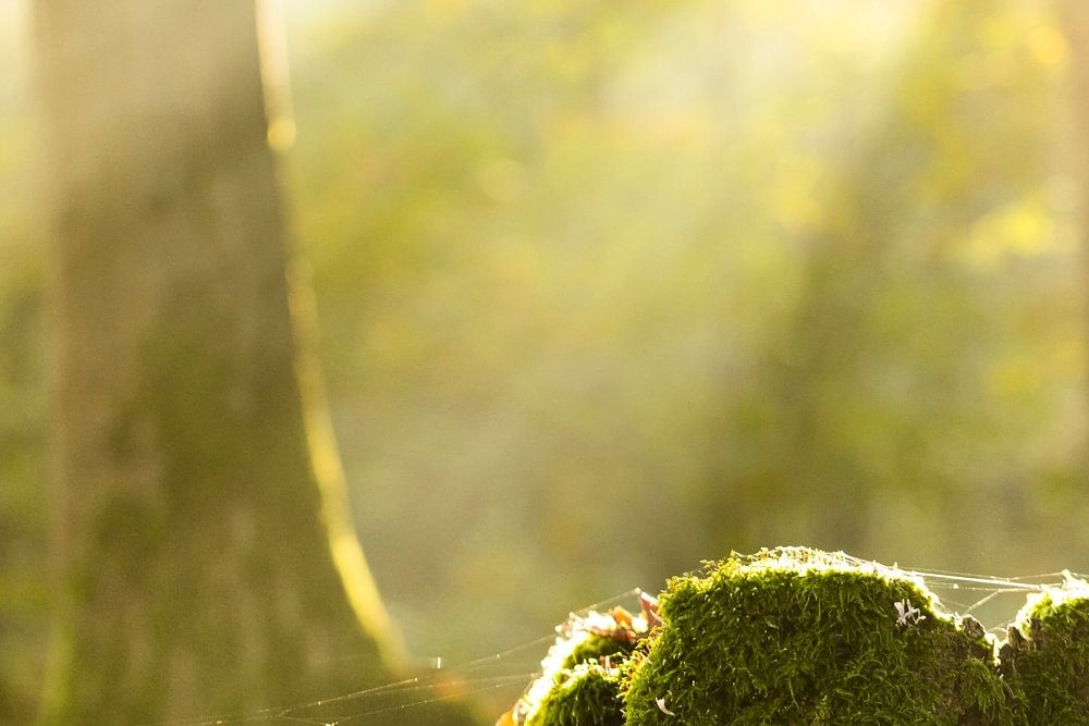 Imagine yourself in the forest on a beautiful morning with the sun peeping between the green and yellow leaves. You can hear the rustle as you walk along the leaf-covered paths. Different melodies of the birds can also be heard in the distance and nearby. You experience an oasis of calm. The warmth of the sun strokes your face and there you see it. Among the trees stands this moss-covered stump. The sun gives it a golden edge and, if you look closely, you can even see the threads of a spider that has made its way from the stump above the leaves past.