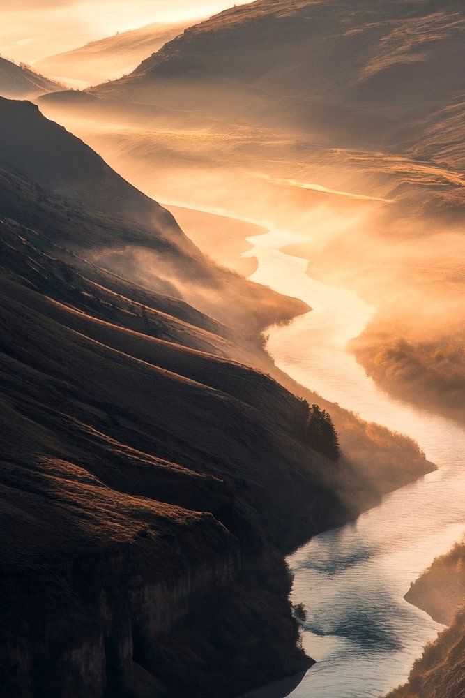 A soft light envelops the valley as a shimmering silver river meanders through the gentle curves of the landscape. Wisps of mist dance mysteriously over the water, and the majestic mountains in the background seem to preserve a faded memory of the past. This harmonious scenery invites you to dream and linger.
