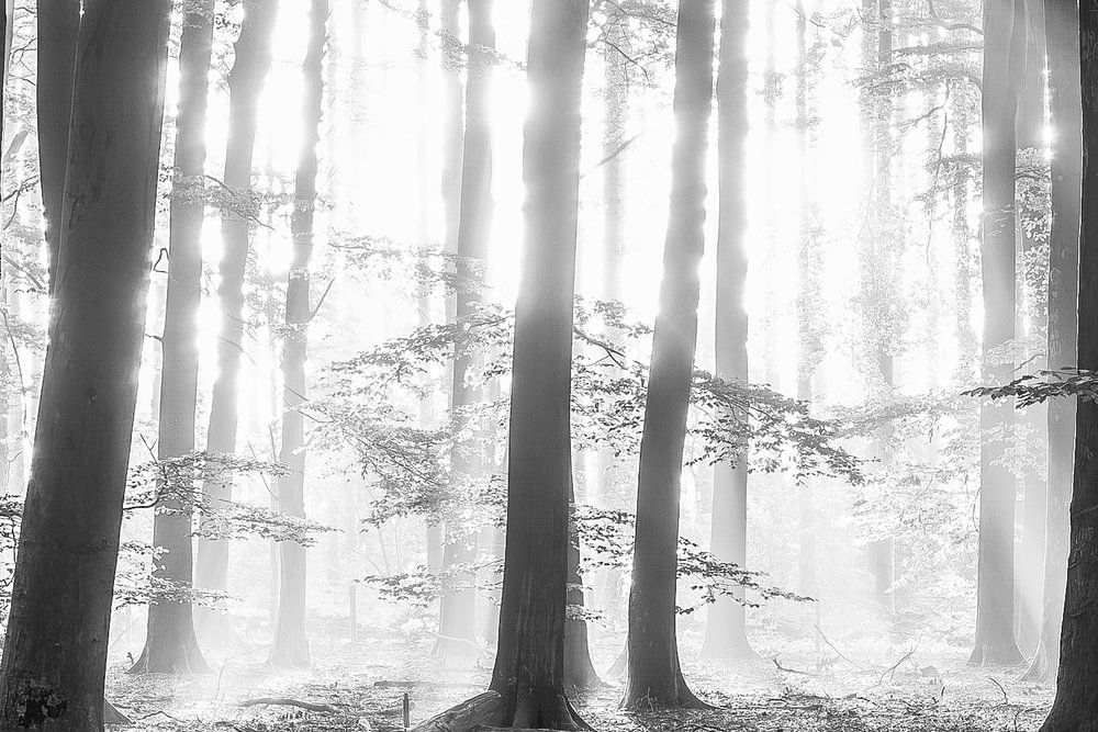 These are the most beautiful spots in a forest. Where the sun manages to push its light through the trees first. The sun is still low and it is as if someone shines a bright lamp straight into the forest. You have the most luck at the edge of a forest, where the trees stop, but there are still plenty for the photo. This is such'a place where I usually start the day when I make a round through the forest. At the request of someone I know, I converted this photo to a black and white version (because of the interior). I had not immediately thought of this myself with this photo, but I am pleasantly surprised with the result.