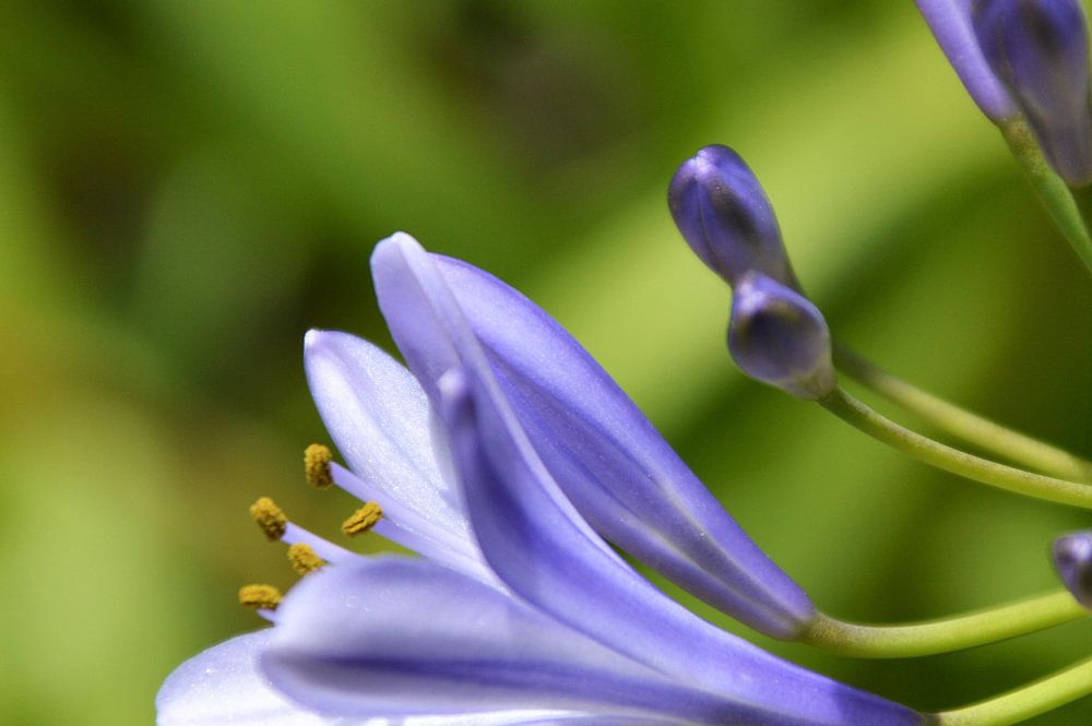 Ze blijven zo mooi... de Afrikaanse Lelie. Het zachte paars op de groene kleur van het gras. Enkele knoppen zijn nog niet klaar, maar deze was er als eerst bij om het zonlicht te begroeten.