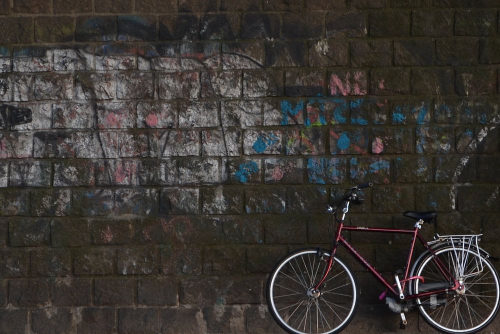 Genomen onder een brug in Nijmegen aan de Waal. Een verlaten fiets met verweerde graffiti.
