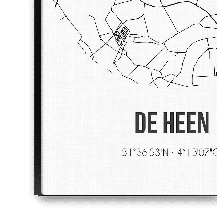 Black and white map, street map or street plan of De Heen. De Heen is located in the municipality of Steenbergen, province of North Brabant. On the city map all public roads in De Heen are included. Furthermore, the map is provided with the coordinates of the center of De Heen.