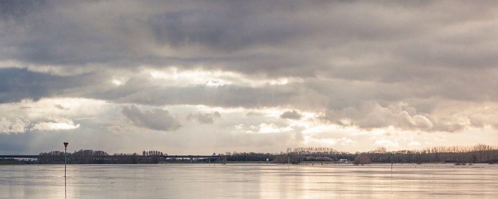 The IJsel after a lot of rainfall and then that giant outside the banks. Cities such as Zutphen, Deventer, Zwole and Kampen have armed themselves with ramparts to prevent flooding.