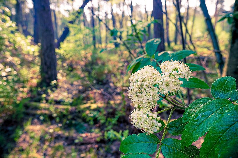 A woodland scene on a sunny day, with a flowering shrub in the foreground, in the Kampina nature reserve near Boxtel, the Netherlands