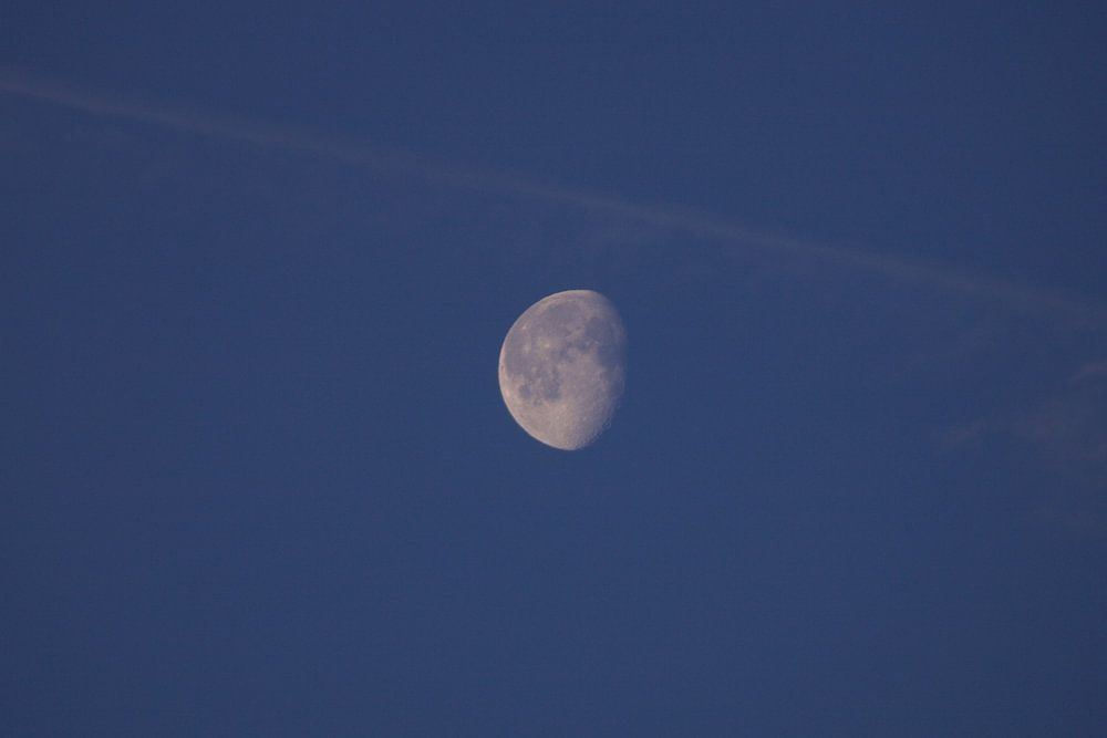 De maan in dachlicht. Een prachtig natuurlijk verschijnsel, waarbij de kleur van de blauwe hemel in dit plaatje de maan omringt. Het hemellichaam komt krachtig naar voren en laat zien hoe mooi ze is.